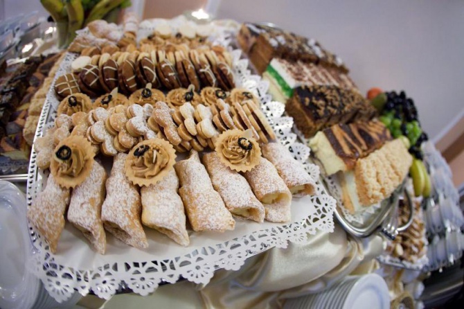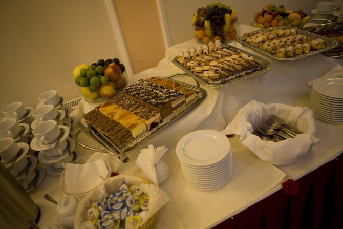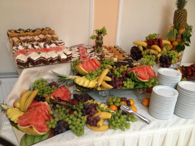 12 przekąsek zimnych, 5 dań gorących, wybór ciast, ciasteczek i owoców, nielimitowane napoje zimne i gorące.(coca cola, sprite, soki- pomarańcz, jabłko, woda gaz. i niegaz.