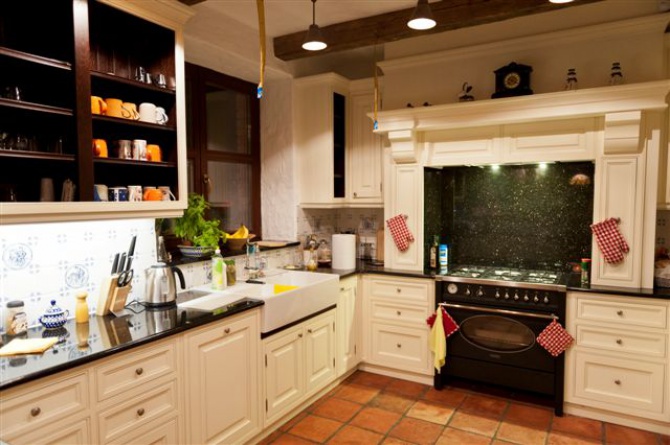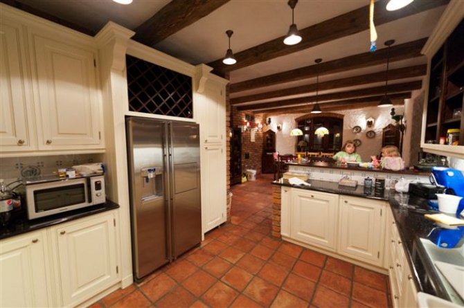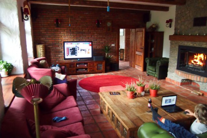 Opis domu:8-pokojowy dom 400 m2 na 3 poziomach: salon z kominkiem, TV 50’, sprzęt stereo, DVD, Blue Ray. Jadalnia ze stołem na 10 osób. Wyjście do ogrodu, na taras. Stara Angielska kuchnia, zmywarka, kuchnia gazowa, kuchenka mikrofalowa, zamrażarka, kostkarka do lodu, ekspres do kawy. Oddzielne WC. Na piętrze: 2 pokoje 20 m2, każdy pokój z 3 łóżkami (90 cm, o długości 200 cm), 2 pokoje 22 m2 z łóżkiem dwuosobowym (160 cm, o długości 200 cm) i kominkiem, 1 pokój dziecięcy 15 m2 z łóżkiem (70 cm, o długości 170 cm) i łóżkiem piętrowym (80 cm, o długości 180 cm). Poddasze: 1 pokój 35 m2 z pojedynczą kanapą (120 cm, o długości 190 cm) i łóżkiem dwuosobowym (160 cm, o długości 200 cm). Wszystkie pokoje posiadają łazienkę, TV i DVD.