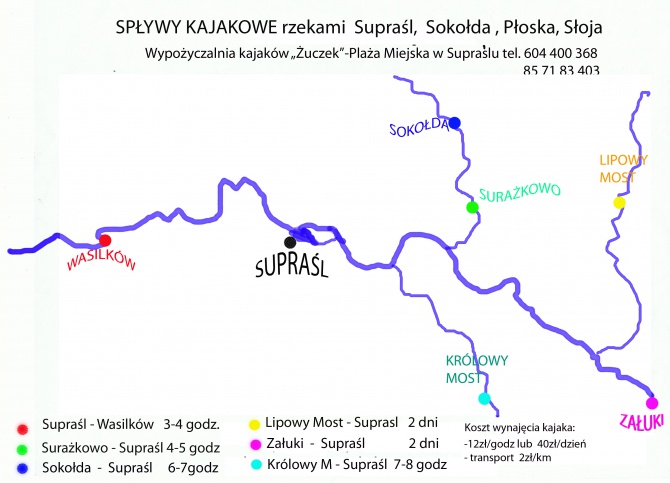 Spływy grupowe(min 4 kajaki) 35/doba + 2zł/dowóz . Obsługujemy rzeki Podlasia Supraśl, Sokołda, Narew, Bug