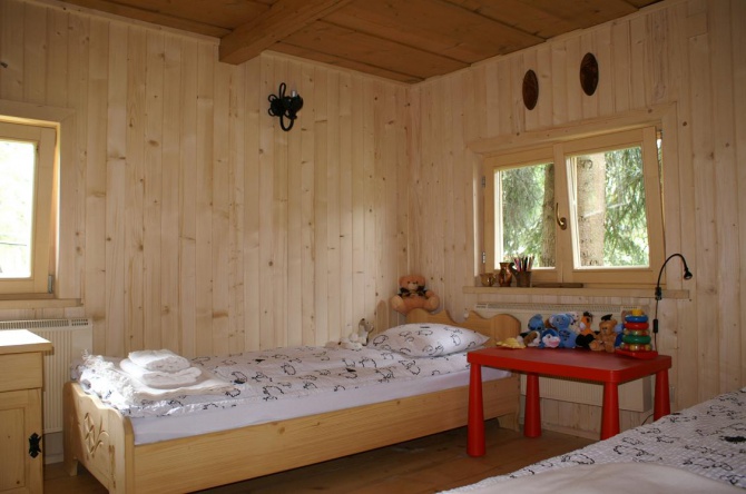 W Kubusiowej Chatce zapewniamy osiem miejsc noclegowych dla osób dorosłych. W chatce są trzy sypialnie (jedna na parterze z kominkiem zamkniętym), łazienka i oddzielna w pełni wyposażona kuchnia. Przed domem znajduje się duży zadaszony taras.